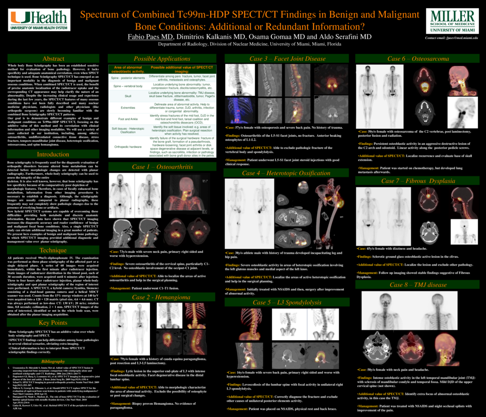 Our goal is to demonstrate different examples of benign and malignant conditions on Tc99m-HDP SPECT/CT, focusing on the additive value of this method and its correlation with clinical information and other imaging modalities. We will use a variety of cases collected in our institution, including, among others: osteoarthritis, undifferentiated connective tissue disease, stress fracture, temporo-mandibular joint disease, heterotopic ossification, osteosarcoma, and spine hemangioma.