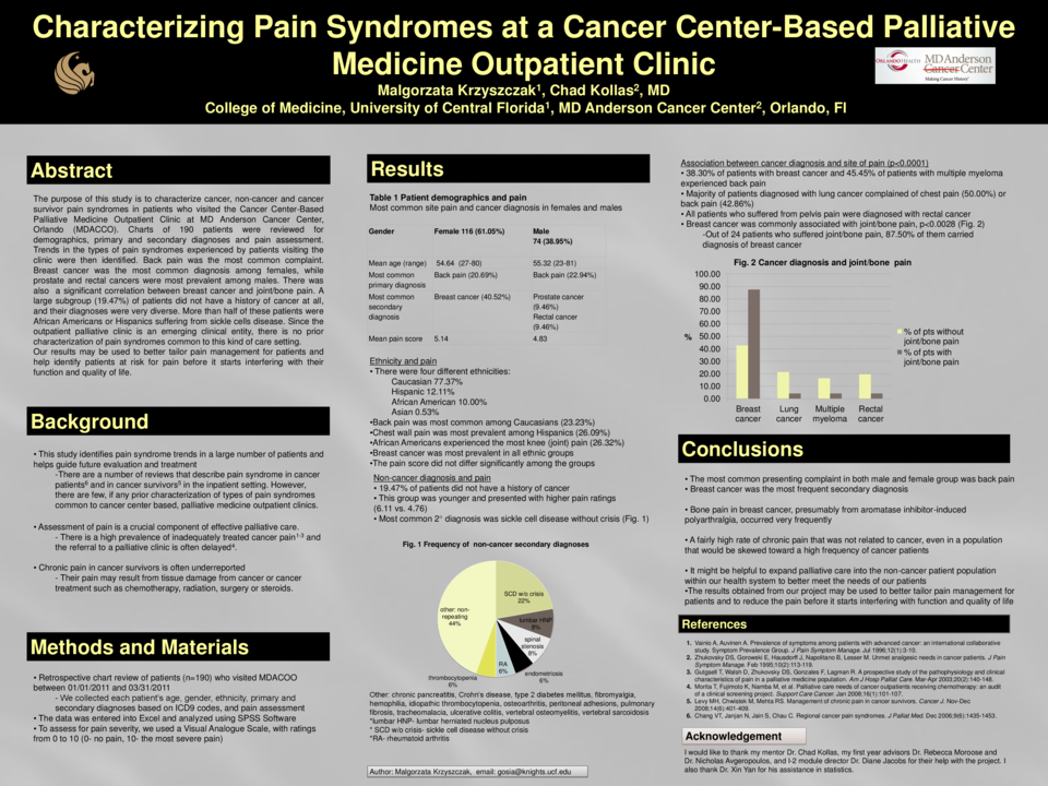 The purpose of this retrospective study is to characterize cancer, non-cancer and cancer survivor pain syndromes in patients who visited the Cancer Center-Based Palliative Medicine Outpatient Clinic at MD Anderson Cancer Center, Orlando (MDACCO). Charts of 190 patients were reviewed to identify demographics, primary and secondary diagnoses and pain assessment. The data was entered into Excel Spreadsheet and converted into SPSS for statistical analysis. Trends in the types of pain syndromes experienced by patients visiting the clinic were then identified. Back pain was the most common complaint, followed by limb and chest pain. Breast cancer was the most common diagnosis among females, while prostate and rectal cancer was most prevalent among males. There was a significant correlation between breast cancer and joint/bone pain (p<0.0028) which could be possibly explained by aromatase inhibitor induced arthralgia. A large subgroup (19.47%) of patients did not have a history of cancer at all, and their diagnoses were very diverse. More than half of these patients were African American and Hispanic suffering from sickle cells disease without crisis. Since the outpatient palliative clinic is an emerging clinical entity, there is no prior characterization of pain syndromes common to this kind of care setting in the medical literature. The results obtained from our project may be used to better tailor pain management for patients and help identify patients at risk for pain before it starts interfering with their function and quality of life.