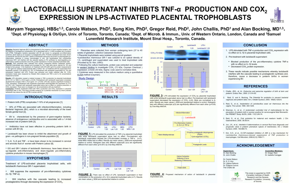 Objective: Bacterial Vaginosis (BV) is characterized by the presence of gram-negative bacteria, and the absence of endogenous Lactobacillus. BV is associated with a 1.4-fold increased risk of preterm birth (PTB). Pathogenic bacteria associated with BV are known to upregulate pro-inflammatory cytokines, which leads to an increase in prostaglandins (PG). Probiotic lactobacilli have been shown to reverse BV and the GG and GR-1 strains of lactobacilli rhamnosus are known to down-regulate pro-inflammatory cytokines in mouse macrophages in vitro. We hypothesized that Lactobacillus rhamnosus GR-1 will interfere with the cascade leading to PG synthesis by down-regulating pro-inflammatory cytokine production and COX2 protein expression in human placental trophoblast cells. Methods: Term placentae were collected from women undergoing elective Caesarean section. Placental trophoblasts were isolated and incubated for 72h. Cells were serum starved for 12h and divided to four groups: 1) No treatment, 2) Treatment with LPS (200 ng/ml for protein measurements or 100 ng/ml for cytokine measurements) after a further 12h, 3) Treatment with the supernatant from lactobacilli cultures (1:20 dilution) for 12h, 4) Pretreatment with lactobacilli supernatant for 12h and subsequent treatment with LPS. Protein was extracted and media collected after 8h. COX2 expression levels were measured by Western Blot analysis and TNF-α and IL-1β concentrations measured by ELISA. Results: LPS stimulation caused a marked increase in TNF-α production by placental trophoblasts (57.5 ± 6.1 to 1609.3 ± 612.6 pg/ml, p<0.05). Pretreatment with lactobacilli supernatant completely abolished this increase (148.4 ± 43.5 pg/ml, n=7, p<0.05). LPS also caused a significant increase in COX2 expression. Pretreatment with lactobacilli supernatant downregulated this expression by 21% (p<0.05, n=8). Treatment with lactobacilli supernatant alone had no effect on cytokine production or COX2 expression. There were no changes in IL-1β concentrations with any treatment. Conclusion: Probiotic lactobacilli inhibit both TNF-α production and COX2 expression in placental trophoblast cells in vitro. This study provides evidence for a potential mechanism by which probiotic lactobacilli may reduce the risk of preterm birth in women with bacterial vaginosis.