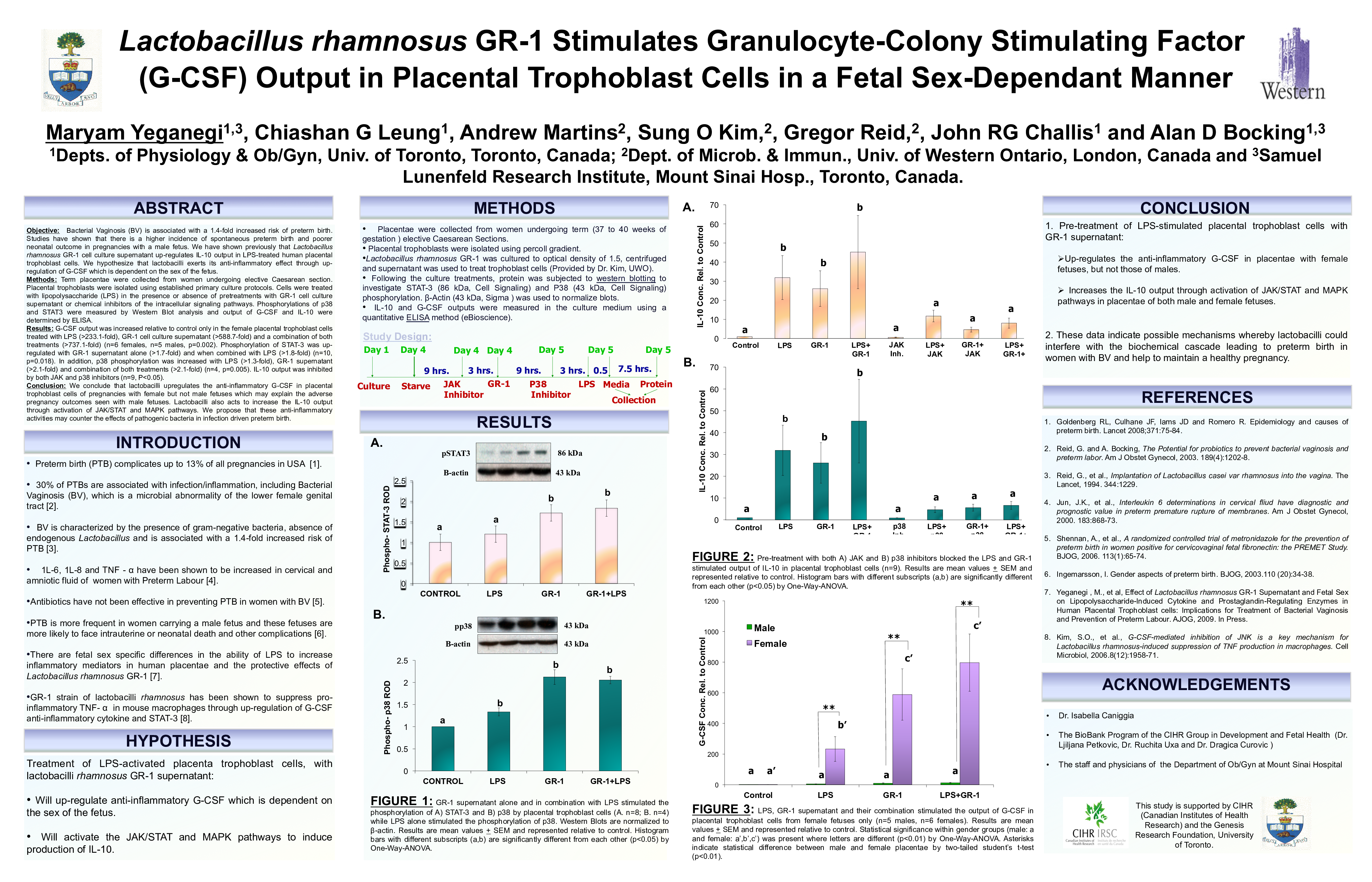 Objective: Bacterial Vaginosis (BV) is associated with a 1.4-fold increased risk of preterm birth. Studies have shown that there is a higher incidence of spontaneous preterm birth and poorer neonatal outcome in pregnancies with a male fetus. We have shown previously that Lactobacillus rhamnosus GR-1 cell culture supernatant up-regulates IL-10 output in LPS-treated human placental trophoblast cells. We hypothesize that lactobacilli exerts its anti-inflammatory effect through up-regulation of G-CSF which is dependent on the sex of the fetus. Methods: Term placentae were collected from women undergoing elective Caesarean section. Placental trophoblasts were isolated using established primary culture protocols. Cells were treated with lipopolysaccharide (LPS) in the presence or absence of pretreatments with GR-1 cell culture supernatant or chemical inhibitors of the intracellular signaling pathways. Phosphorylations of p38 and STAT3 were measured by Western Blot analysis and output of G-CSF and IL-10 were determined by ELISA. Results: G-CSF output was increased relative to control only in the female placental trophoblast cells treated with LPS (>233.1-fold), GR-1 cell culture supernatant (>588.7-fold) and a combination of both treatments (>737.1-fold) (n=6 females, n=5 males, p=0.002). Phosphorylation of STAT-3 was up-regulated with GR-1 supernatant alone (>1.7-fold) and when combined with LPS (>1.8-fold) (n=10, p=0.018). In addition, p38 phosphorylation was increased with LPS (>1.3-fold), GR-1 supernatant (>2.1-fold) and combination of both treatments (>2.1-fold) (n=4, p=0.005). IL-10 output was inhibited by both JAK and p38 inhibitors (n=9, P<0.05). Conclusion: We conclude that lactobacilli upregulates the anti-inflammatory G-CSF in placental trophoblast cells of pregnancies with female but not male fetuses which may explain the adverse pregnancy outcomes seen with male fetuses. Lactobacilli also acts to increase the IL-10 output through activation of JAK/STAT and MAPK pathways. We propose that the upregulation of the anti-inflammatory G-CSF and IL-10 by probiotic lactobacilli may counter the effects of pathogenic bacteria in infection driven preterm birth.