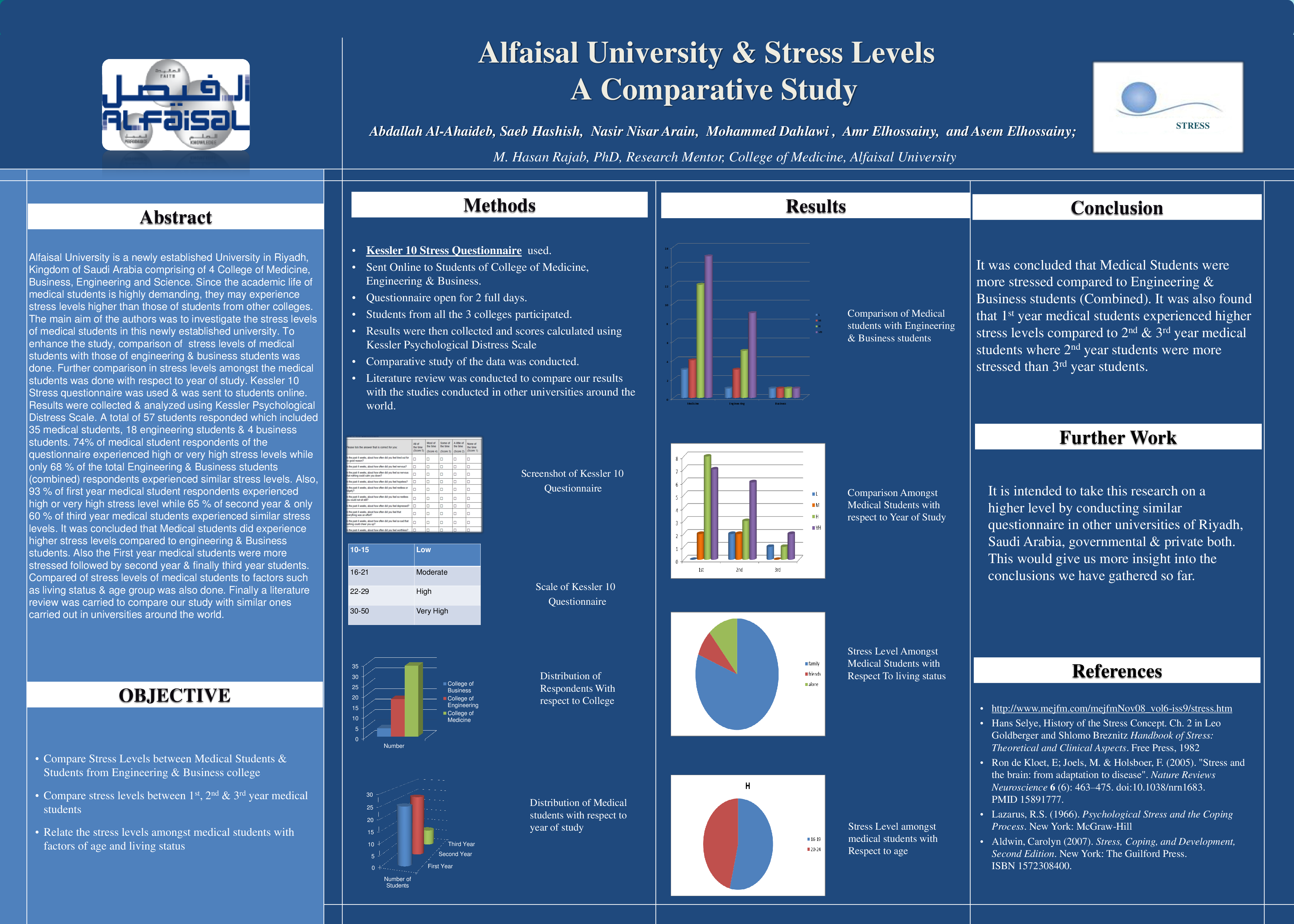 Alfaisal University is a newly established University in Riyadh, Kingdom of Saudi Arabia comprising of 4 College of Medicine, Business, Engineering and Science. Since the academic life of medical students is highly demanding, they may experience stress levels higher than those of students from other colleges. The main aim of the authors was to investigate the stress levels of medical students in this newly established university. To enhance the study, comparison of stress levels of medical students with those of engineering & business students was done. Further comparison in stress levels amongst the medical students was done with respect to year of study. Kessler 10 Stress questionnaire was used & was sent to students online. Results were collected & analyzed using Kessler Psychological Distress Scale. A total of 57 students responded which included 35 medical students, 18 engineering students & 4 business students. 74% of medical student respondents of the questionnaire experienced high or very high stress levels while only 68 % of the total Engineering & Business students (combined) respondents experienced similar stress levels. Also, 93 % of first year medical student respondents experienced high or very high stress level while 65 % of second year & only 60 % of third year medical students experienced similar stress levels. It was concluded that Medical students did experience higher stress levels compared to engineering & Business students. Also the First year medical students were more stressed followed by second year & finally third year students. Compared of stress levels of medical students to factors such as living status & age group was also done. Finally a literature review was carried to compare our study with similar ones carried out in universities around the world.