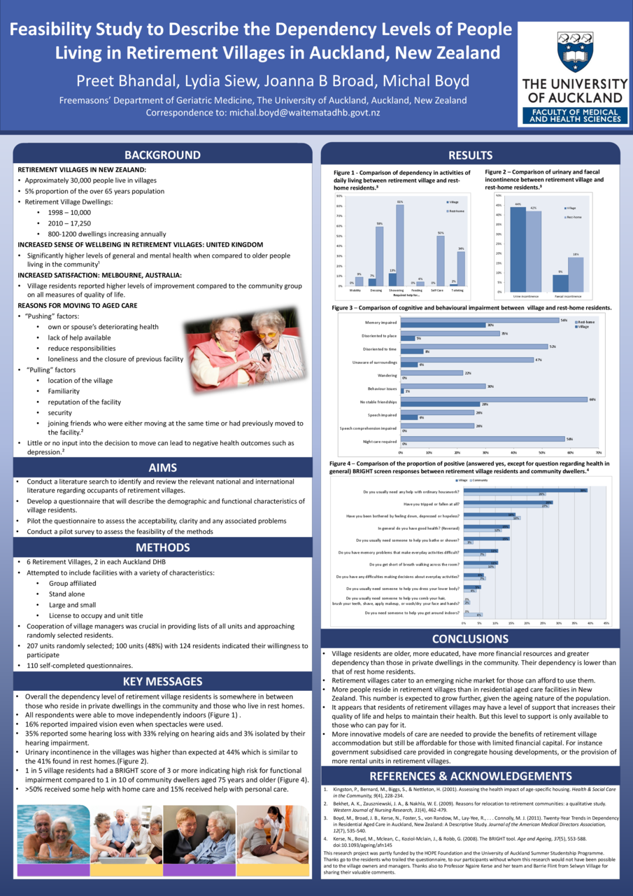 Methods - A list of villages (n=81) in Auckland was compiled from various internet sources. Two villages were purposively selected from each of three DHBs, balancing size, ownership type and care services available. Managers provided village information, then units were randomly selected to recruit ~20 residents from each village. Management initially wrote to residents to invite participation. The questionnaire was adapted from the 2008 Auckland Long Term Care Study and self-completed by participants after formal consent.