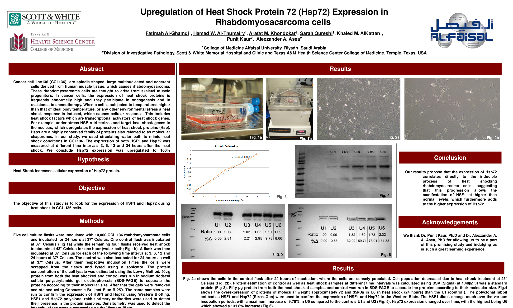 Cancer cell line136 (CCL136) are spindle shaped, large multinucleated and adherent cells derived from human muscle tissue, which causes rhabdomyosarcoma. These rhabdomyosarcoma cells are thought to arise from skeletal muscle progenitors. In cancer cells, the expression of heat shock proteins is frequently abnormally high and they participate in oncogenesis and in resistance to chemotherapy. When a cell is subjected to temperatures higher than that of ideal body temperature, or any other environmental stress a heat shock response is induced, which causes cellular response. This includes heat shock factors which are transcriptional activators of heat shock genes. For example, under stress HSF1s trimerizes and target heat shock genes in the nucleus, which upregulates the expression of heat shock proteins (Hsp). Hsps are a highly conserved family of proteins also referred to as molecular chaperones. In our study, we used circulating water bath to mimic heat shock conditions in CCL136. The expression of both HSF1 and Hsp72 was measured at different time intervals 3, 6, 12 and 24 hours after the heat shock. We conclude Hsp72 expression was upregulated to 100% approximately after 12 hours.