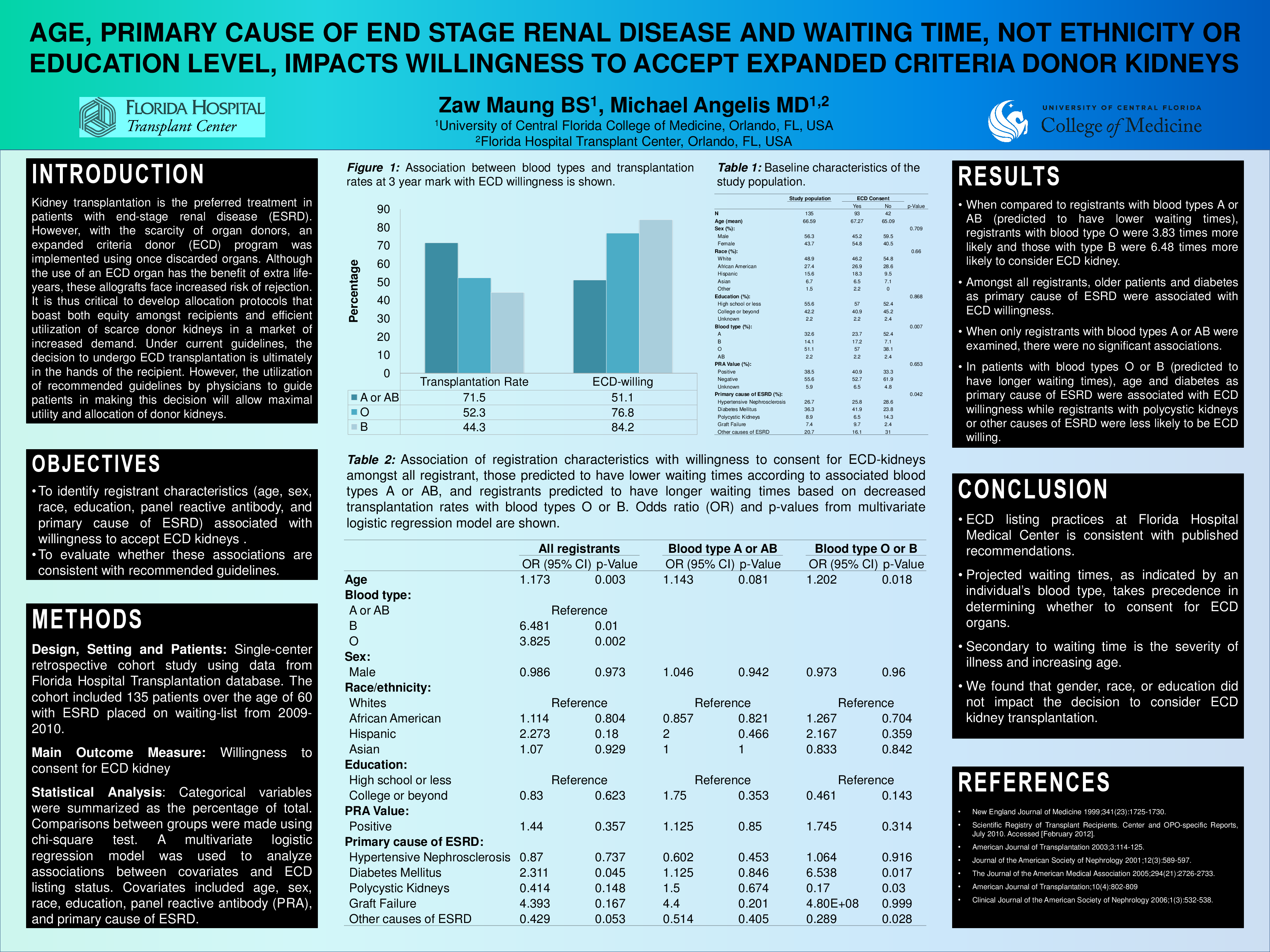 Conclusions: ECD listing practices at Florida Hospital Medical Center is consistent with published recommendations. Projected waiting times, as indicated by an individual’s blood type, takes precedence in the determining whether to consent for ECD organs. Secondary to waiting time is the severity of illness and increasing age. We found that gender, race, or education did not impact the decision to consider ECD kidney transplantation.