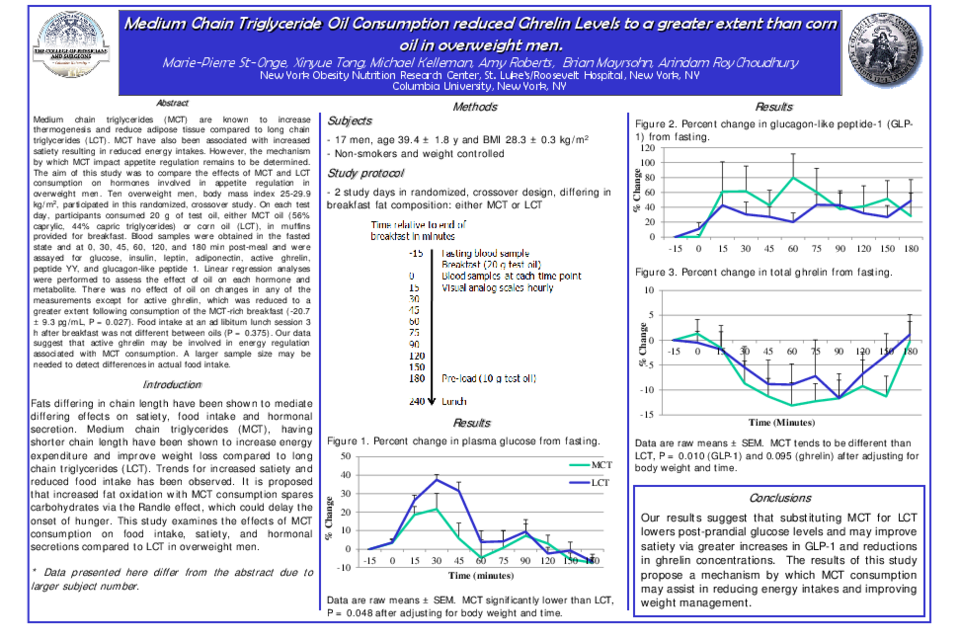 Medium chain triglycerides (MCT) are known to increase thermogenesis and reduce adipose tissue compared to long chain triglycerides (LCT). MCT have also been associated with increased satiety resulting in reduced energy intakes. However, the mechanism by which MCT impact appetite regulation remains to be determined. The aim of this study was to compare the effects of MCT and LCT consumption on hormones involved in appetite regulation in overweight men. Ten overweight men, body mass index 25-29.9 kg/m2, participated in this randomized, crossover study. On each test day, participants consumed 20 g of test oil, either MCT oil (56% caprylic, 44% capric triglycerides) or corn oil (LCT), in muffins provided for breakfast. Blood samples were obtained in the fasted state and at 0, 30, 45, 60, 120, and 180 min post-meal and were assayed for glucose, insulin, leptin, adiponectin, active ghrelin, peptide YY, and glucagon-like peptide 1. Linear regression analyses were performed to assess the effect of oil on each hormone and metabolite. There was no effect of oil on changes in any of the measurements except for active ghrelin, which was reduced to a greater extent following consumption of the MCT-rich breakfast (-20.7 ± 9.3 pg/mL, P = 0.027). Food intake at an ad libitum lunch session 3 h after breakfast was not different between oils (P = 0.375). Our data suggest that active ghrelin may be involved in energy regulation associated with MCT consumption. A larger sample size may be needed to detect differences in actual food intake.