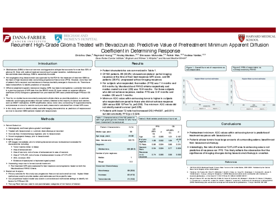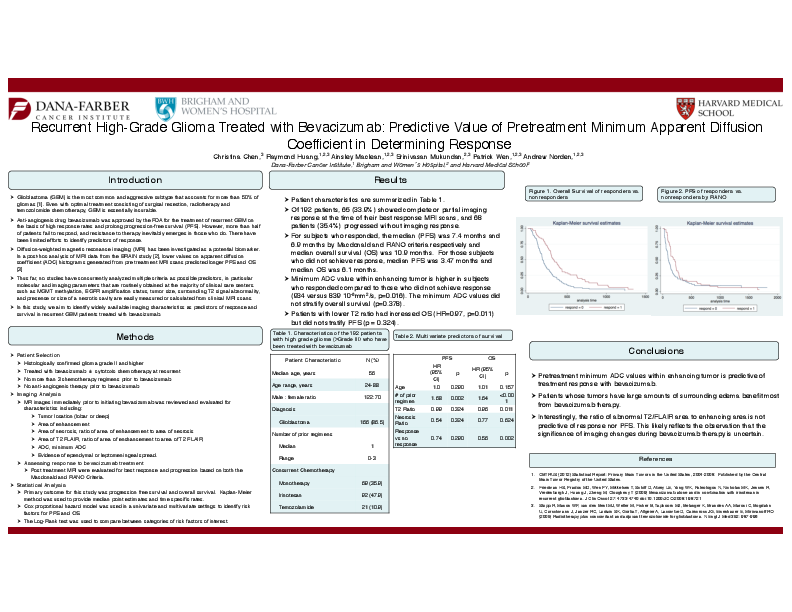 METHODS: MRI scans from 192 patients with recurrent high-grade glioma obtained immediately prior to initiating bevacizumab were reviewed for area of enhancement, area of necrosis, area of T2/FLAIR abnormality, average and minimum ADC values, and evidence of ependymal or leptomeningeal spread. Serial MRI scans following the initiation of bevacizumab were evaluated for response and progression using RANO criteria. Non-radiographic predictors included sex, histology, EGFR status, MGMT promoter methylation status, number of prior regimens, and bevacizumab use as monotherapy or with cytotoxic chemotherapy.