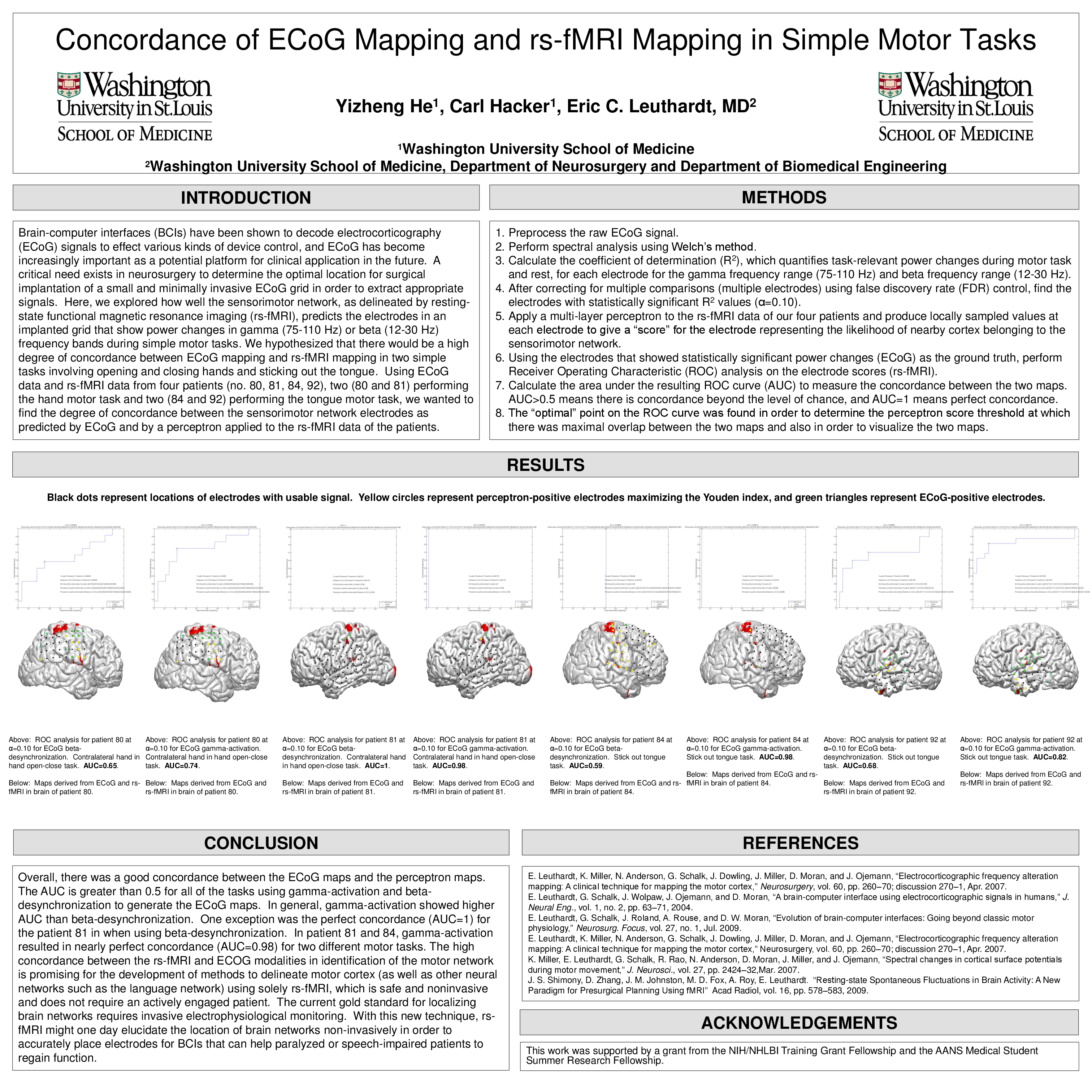 Brain-computer interfaces (BCIs) have been shown to decode electrocorticography (ECoG) signals to effect various kinds of device control, and ECoG has become increasingly important as a potential platform for clinical application in the future. A critical need exists in neurosurgery to determine the optimal location for surgical implantation of a small and minimally invasive ECoG grid in order to extract appropriate signals. Here, we explored how well the sensorimotor network, as delineated by resting-state functional magnetic resonance imaging (rs-fMRI), predicts the electrodes in an implanted grid that show power changes in gamma (75-110 Hz) or beta (12-30 Hz) frequency bands during simple motor tasks. We hypothesized that there would be a high degree of concordance between ECoG mapping and rs-fMRI mapping in two simple tasks involving opening and closing hands and sticking out the tongue. Using ECoG data and rs-fMRI data from four patients (no. 80, 81, 84, 92), two (80 and 81) performing the hand motor task and two (84 and 92) performing the tongue motor task, we wanted to find the degree of concordance between the sensorimotor network electrodes as predicted by ECoG and by a perceptron applied to the rs-fMRI data of the patients.