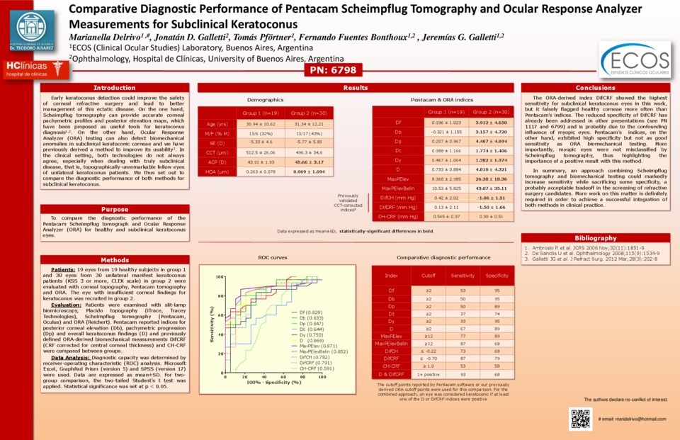 Conclusions: ORA-derived index DifCRF has higher sensitivity for subclinical keratoconus eyes but falsely flags healthy corneae more often than Pentacam’s indices, which in the other hand show high specificity. An approach combining both methods could markedly increase sensitivity while sacrificing some specificity, a probably acceptable tradeoff in the screening of refractive surgery candidates.