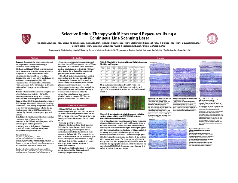 Methods: A 532 nm Nd:YAG laser with retinal beam diameters of 40 and 66 μm was applied to 60 eyes of 30 Dutch-Belted rabbits. Retinal exposure duration varied from 15 to 60 μs. Lesions were acutely assessed by ophthalmoscopy and fluorescein angiography (FA). RPE flatmounts were evaluated with LIVE/DEAD fluorescent assay (LD). Histological analysis was performed at 7 time points from 1 hour to 2 months.