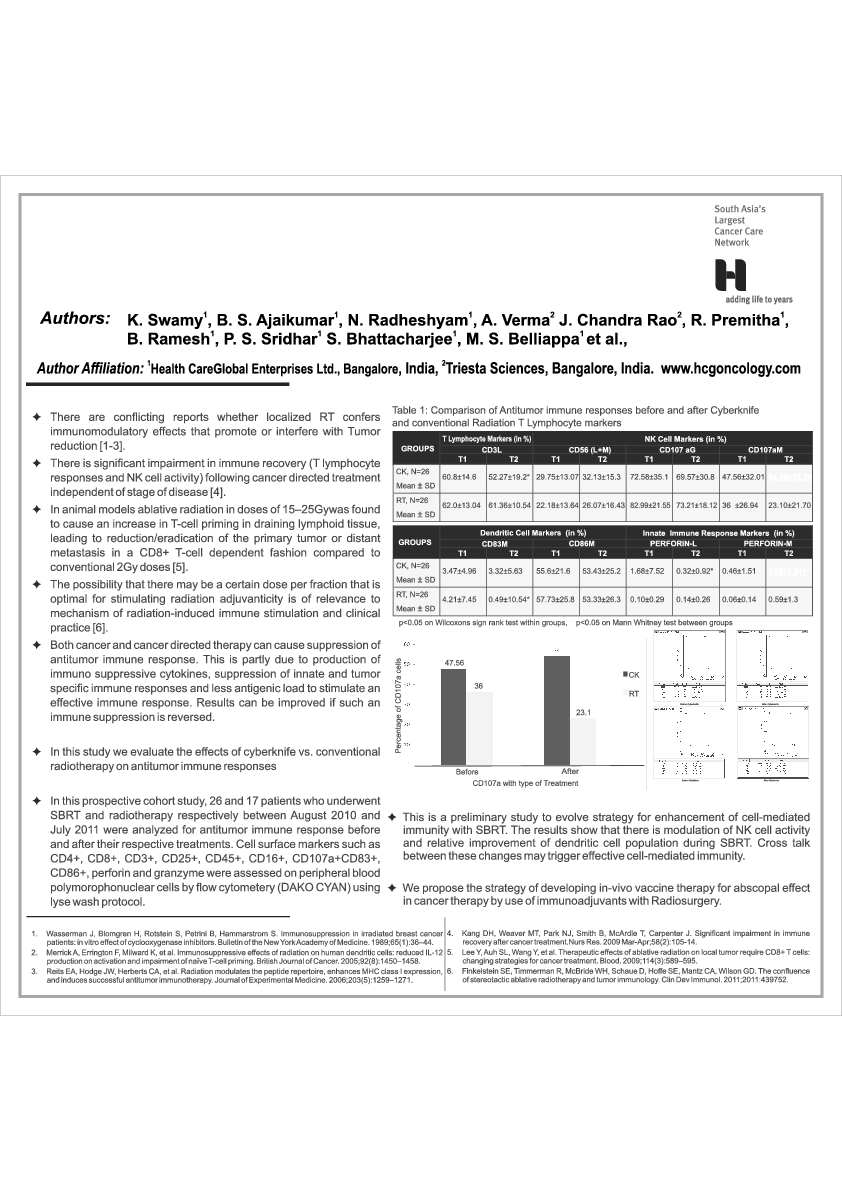In this prospective cohort study, 26 and 17 patients who underwent SBRT and radiotherapy respectively were analyzed for antitumor immune response before and after their respective treatments. Cell surface markers such as CD4+, CD8+, CD3+,CD25+, CD45+,CD16+, CD107a+CD83+, CD86+, perforin and g r a n z yme were assessed on peripheral blood polymoropho-nuclear cells by flow cytometery (DAKO CYAN) using lyse wash protocol