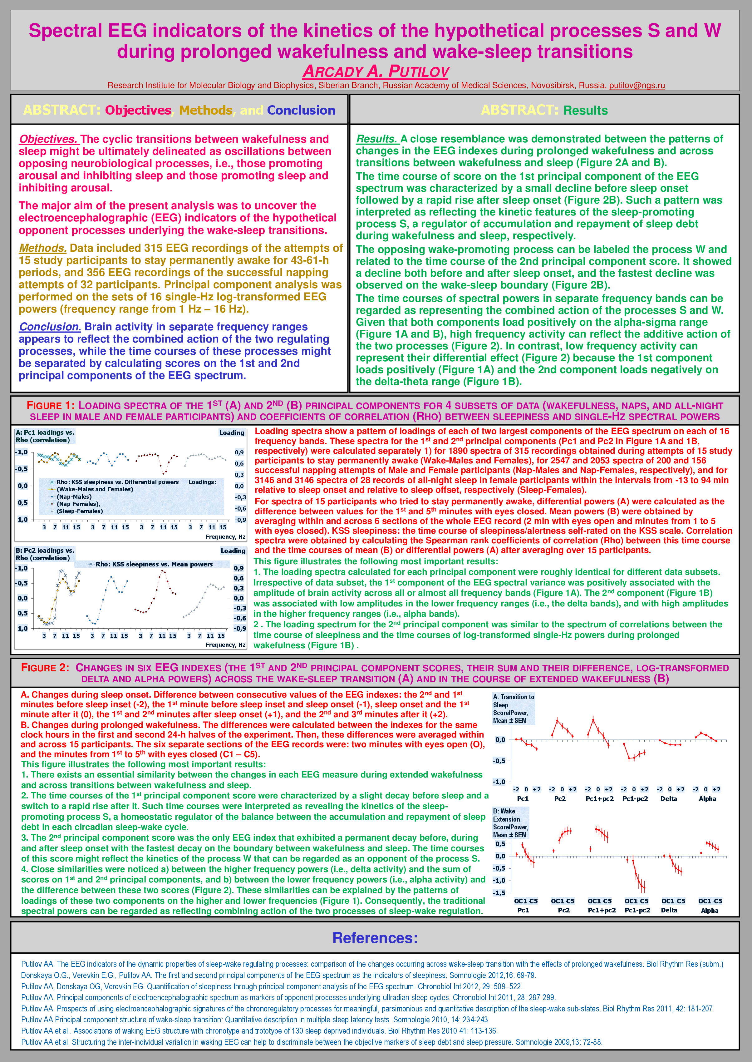 Results. A close resemblance was demonstrated between the patterns of changes in the EEG indexes during prolonged wakefulness and across transitions between wakefulness and sleep.