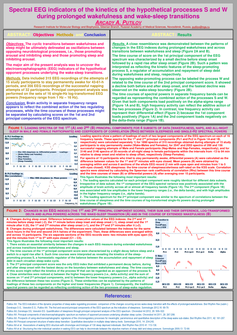 The time courses of spectral powers in separate frequency bands can be regarded as representing the combined action of the processes S and W. Given that both components load positively on the alpha-sigma range, high frequency activity can reflect the additive action of the two processes. In contrast, low frequency activity can represent their differential effect because the 1st component loads positively and the 2nd component loads negatively on the delta-theta range.