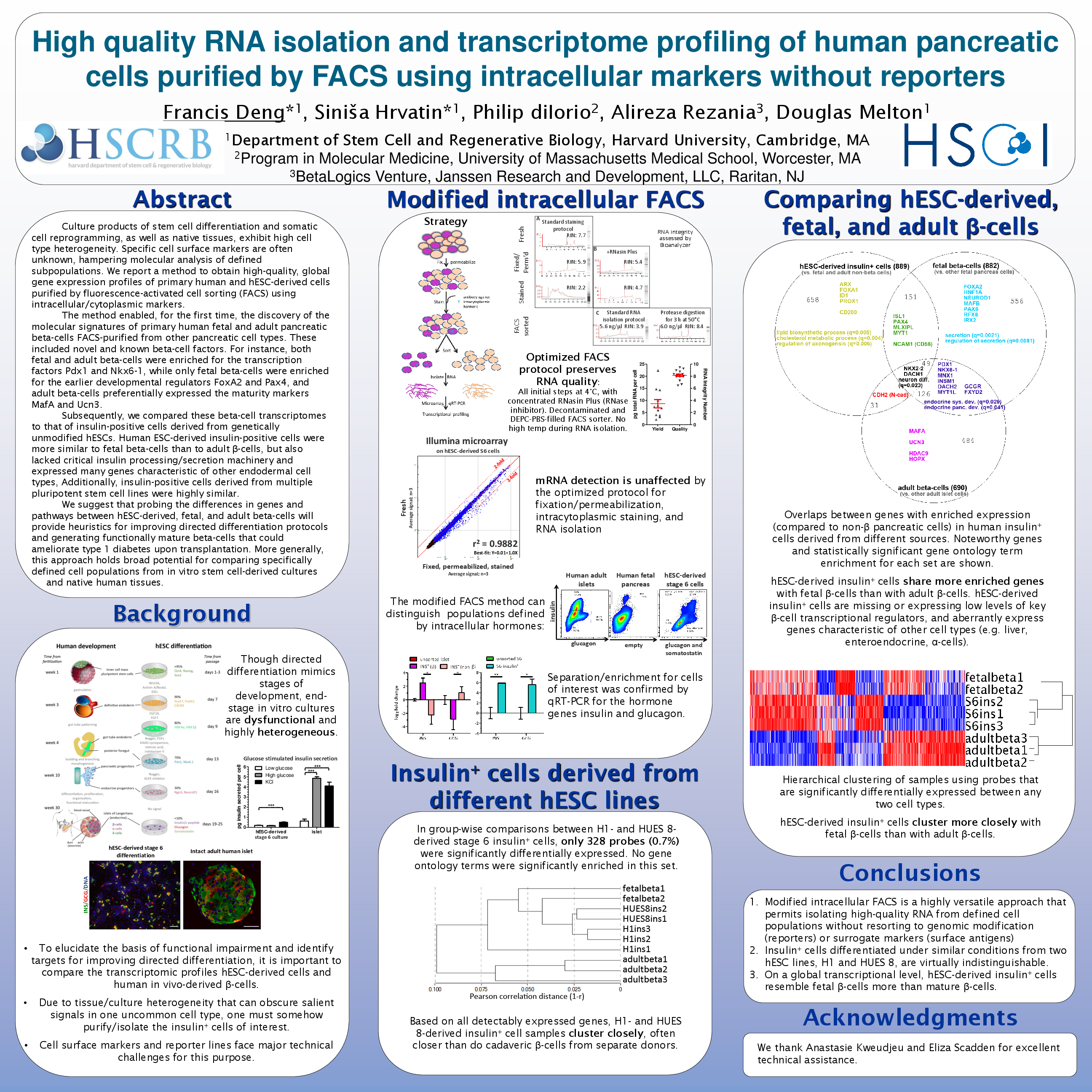 The method enabled, for the first time, the discovery of the molecular signatures of primary human fetal and adult pancreatic beta-cells FACS-purified from other pancreatic cell types. These included novel and known beta-cell factors. For instance, both fetal and adult beta-cells were enriched for the transcription factors Pdx1 and Nkx6-1, while only fetal beta-cells were enriched for the earlier developmental regulators FoxA2 and Pax4, and adult beta-cells preferentially expressed the maturity markers MafA and Ucn3.