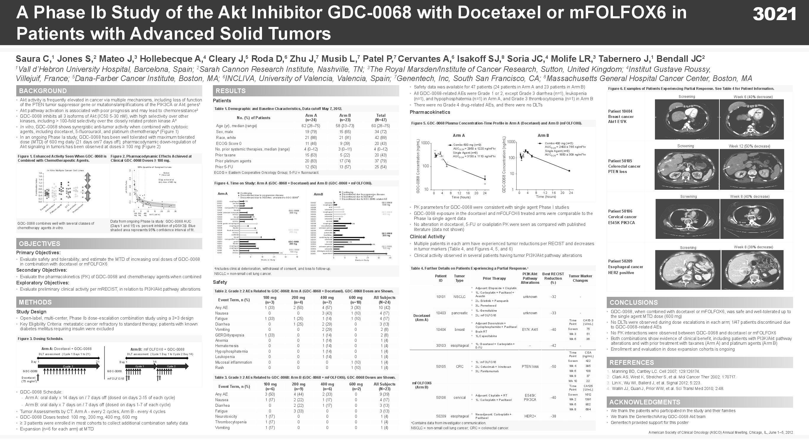 Akt activity is frequently elevated in cancer via multiple mechanisms, including loss of function of the PTEN tumor suppressor gene or mutations/amplifications of the PIK3CA or Akt genes1. Akt pathway activation is associated with poor prognosis and may lead to chemoresistance2. GDC-0068 inhibits all 3 isoforms of Akt (IC50 5-30 nM), with high selectivity over other kinases, including > 100-fold selectivity over the closely related protein kinase A3. In vitro, GDC-0068 shows synergistic anti-tumor activity when combined with cytotoxic agents, including docetaxel, 5-fluorouracil, and platinum chemotherapy4. In an ongoing Phase Ia study, GDC-0068 has been well tolerated with maximum tolerated dose (MTD) of 600 mg daily (21 days on/7 days off); pharmacodynamic down-regulation of Akt signaling in tumors has been observed at doses ≥ 100 mg.