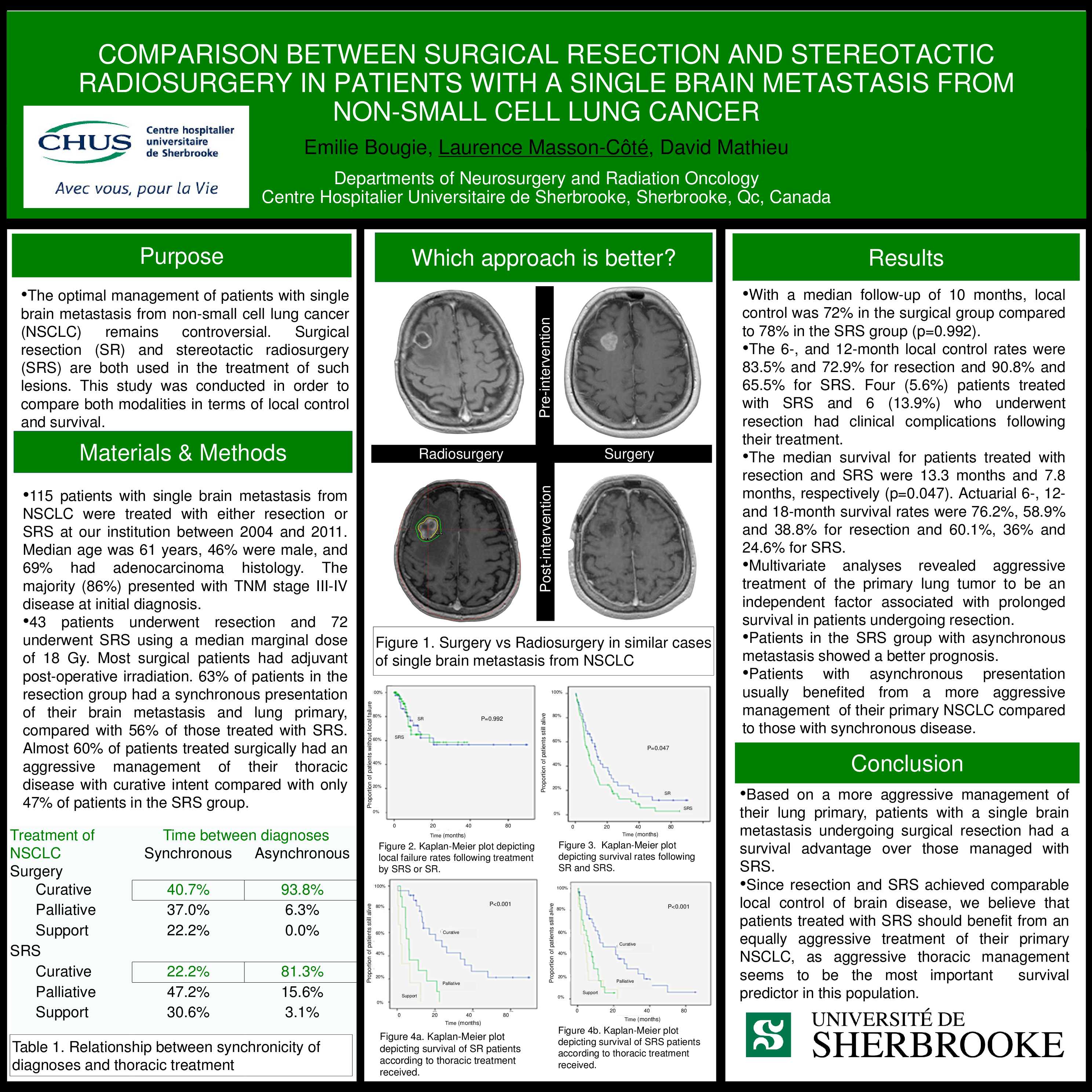 •43 patients underwent resection and 72 underwent SRS using a median marginal dose of 18 Gy. Most surgical patients had adjuvant post-operative irradiation. 63% of patients in the resection group had a synchronous presentation of their brain metastasis and lung primary, compared with 56% of those treated with SRS. Almost 60% of patients treated surgically had an aggressive management of their thoracic disease with curative intent compared with only 47% of patients in the SRS group.