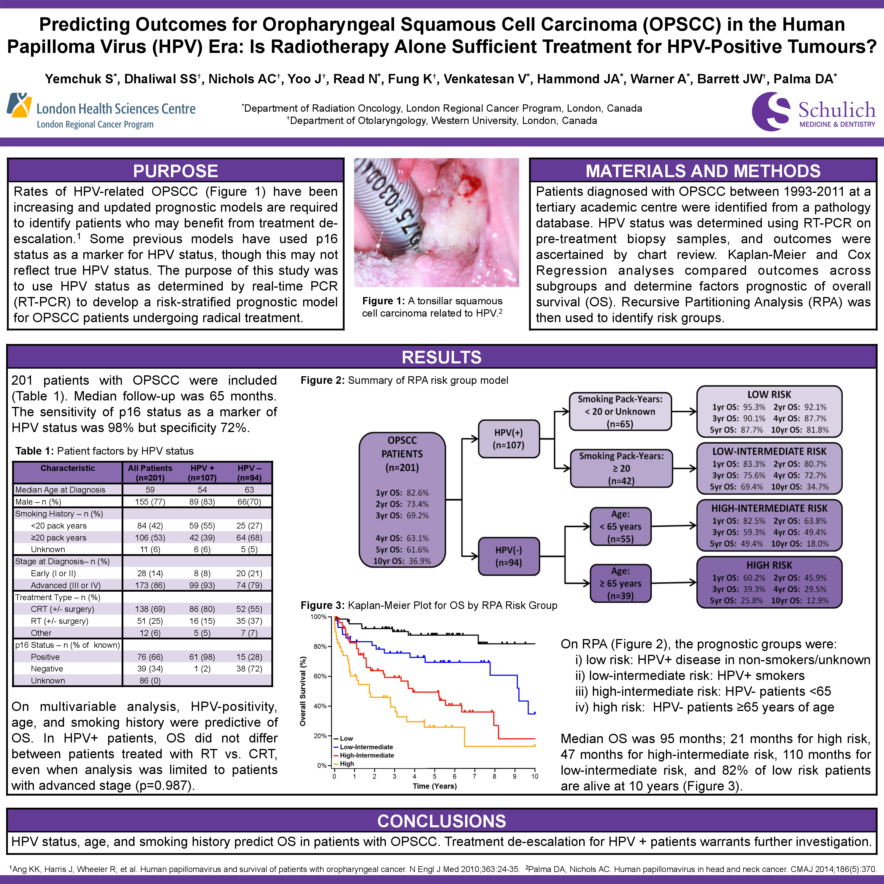 Materials and Methods: Patients diagnosed with OPSCC between 1993-2011 at a tertiary academic centre were identified from a pathology database. HPV status was determined using real-time PCR on pre-treatment primary biopsy samples, and outcomes were ascertained by chart review. Kaplan-Meier and Cox Regression analyses were used to compare outcomes across subgroups and determine factors prognostic of overall survival (OS). Recursive Partitioning Analysis (RPA) was then used to identify risk groups.