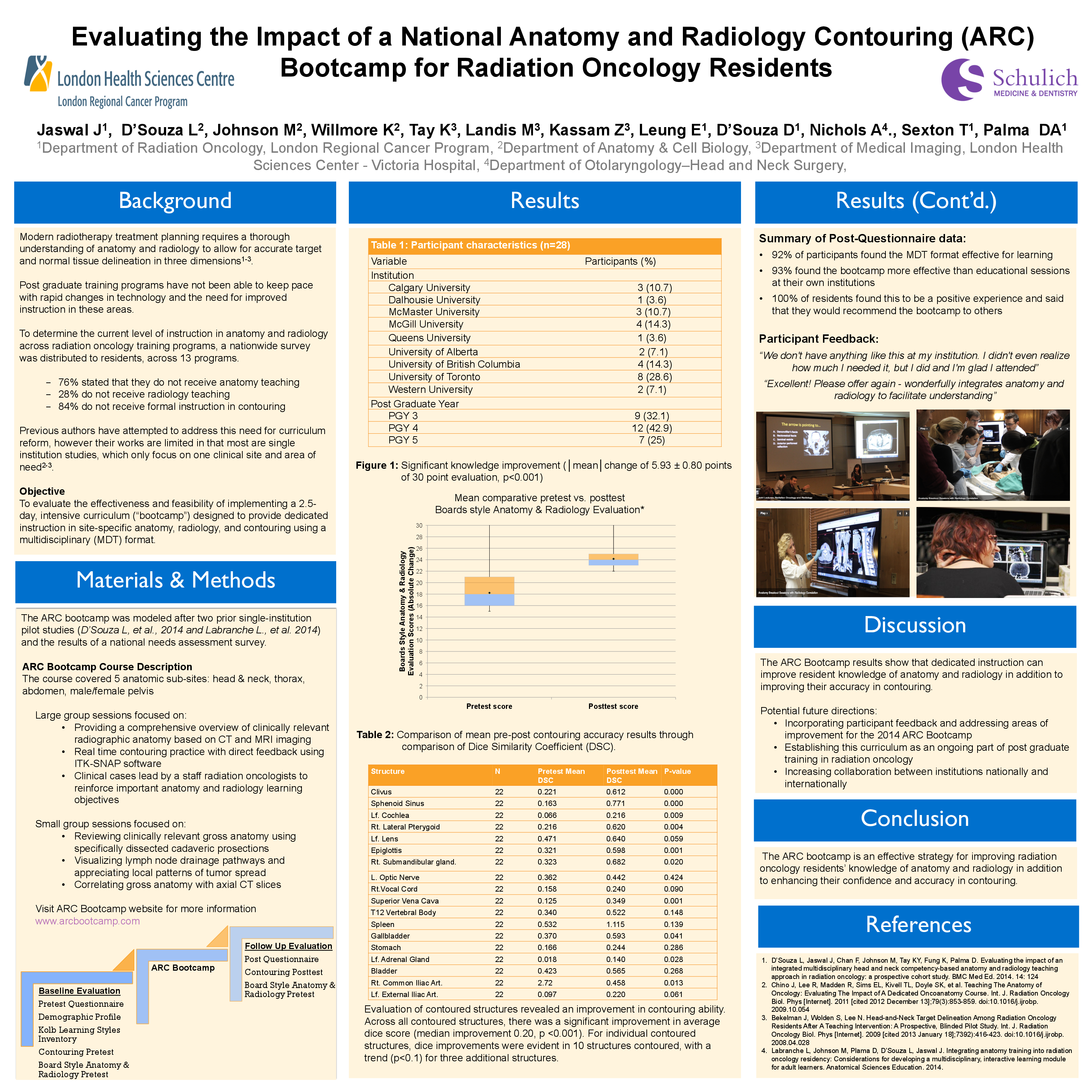 Conclusions: The ARC bootcamp is an effective strategy for improving radiation oncology residents’ knowledge of anatomy and radiology in addition to enhancing their confidence and accuracy in contouring.