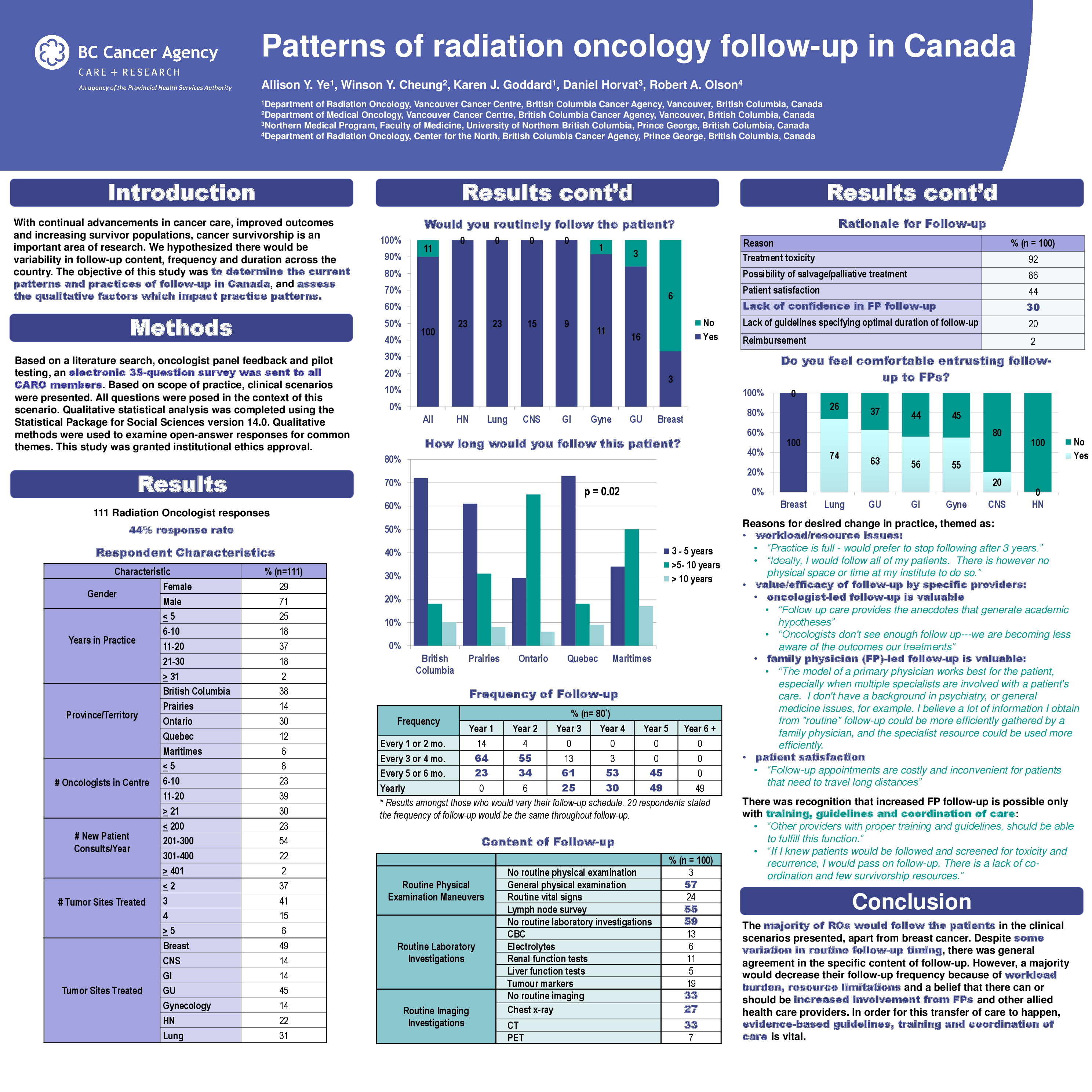 Results: In total, 111 radiation oncologists (RO) responded (44% response rate); 29% were female, 43% were in practice less than 10 years, and most regions of Canada were well represented. Most worked in centers staffed by more than 10 oncologists (69%), and saw more than 200 new patient consults per year (78%). Ten percent would not follow patients routinely, mainly in cases involving breast or prostate survivors. Seventy-three percent of such patients (73%) would be followed by their primary care providers (PCP) whereas ROs would follow their CNS, GI, HN and GYNE patients. Lack of resources (55%) and a belief that follow-up by PCPs is equally effective (55%) were the top two reasons for not following patients. Treatment toxicity (92%) and the possibility of salvage or palliative treatment (86%) were the two most common reasons for routine follow-up. The majority (55%) of ROs follow patients for <5 years, with 36% following for 5-10 years, and a minority (9%) following for longer than 10 years. Fifty-four percent would not change the frequency of their follow-up, but 39% would decrease and only 7% would make no change. Workload and lack of resources were major barriers to follow-up, but in addition, many felt that follow-up by FPs or Advanced Practice Nurses could be equally effective. Some felt this would require additional training and more guidelines to make this effective.