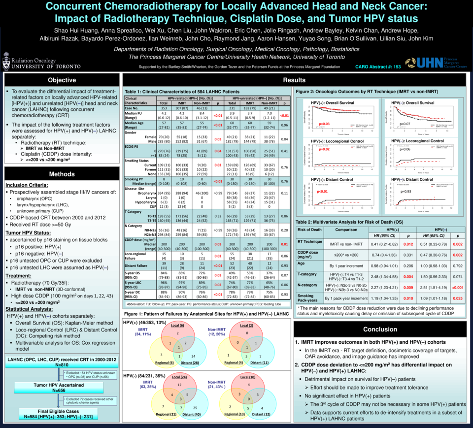 Purpose: To investigate the impact of radiation (RT) technique and cisplatin (CDDP) dose intensity (mg/m2) on outcomes of patients (pts) with HPV-related [HPV(+)] and unrelated [HPV(–)] locally advanced (stage III/IV) head and neck cancer (LAHNC) following concurrent chemoradiation (CRT).